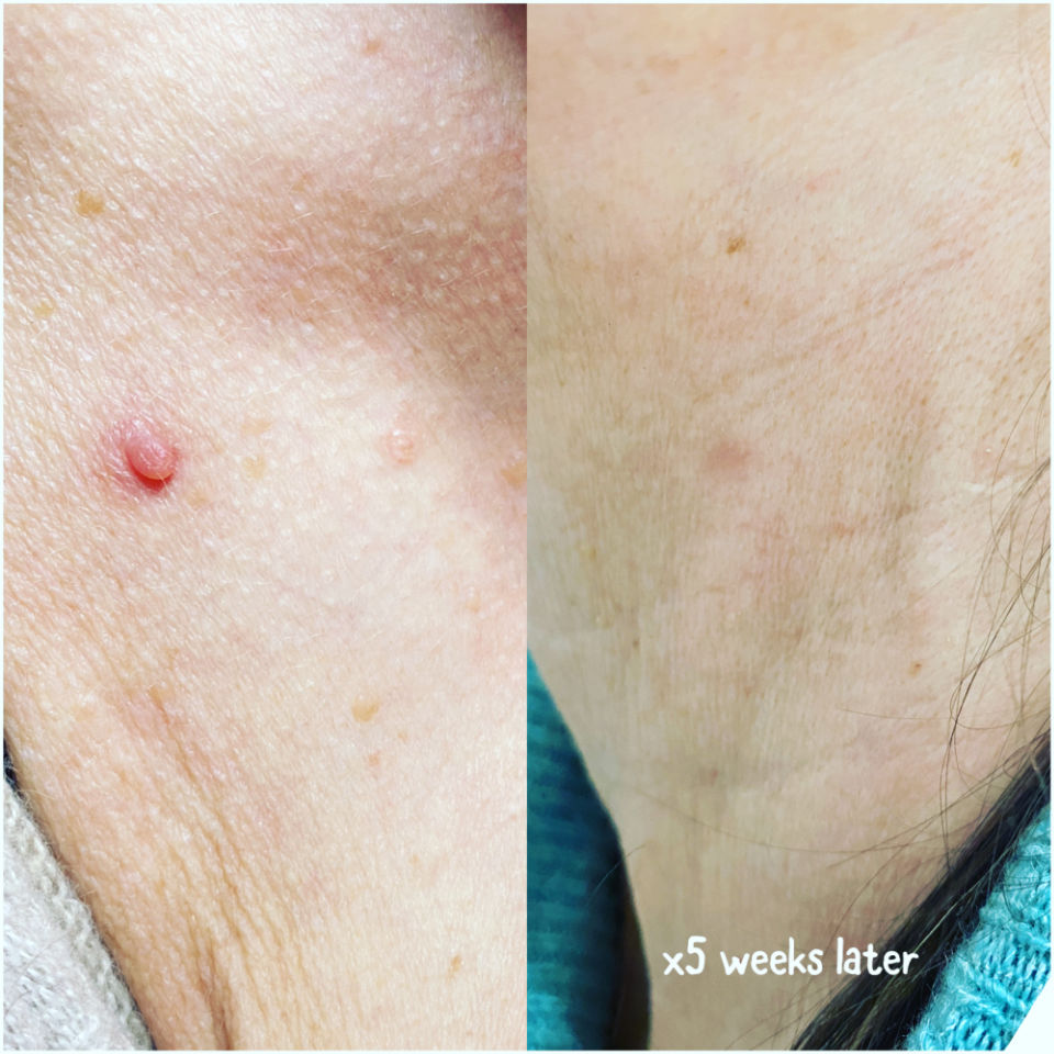 Typically, it leaves the least amount of scarring of any form of lesion removal because it causes the least damage to the connective tissues. Hypopigmented lesions will be noticeable until they darken.